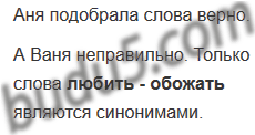 Прочитайте слова, которые Аня и Ваня считают синонимами. Верно ли они подобрали слова в группы?